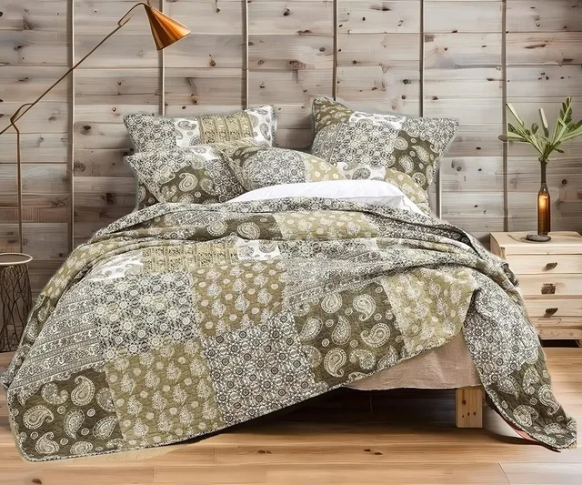- Accented with floral paisley patchwork squares and hints of brown, olive green, and tan shades making a beautiful and unique combination.